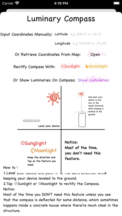 Luminary Compass: Compute the current Sun or Moon direction to help rectify the built-in compass. The built-in compass sometimes will be deflected for quite some distance especially when you are in a reinforced concrete building.