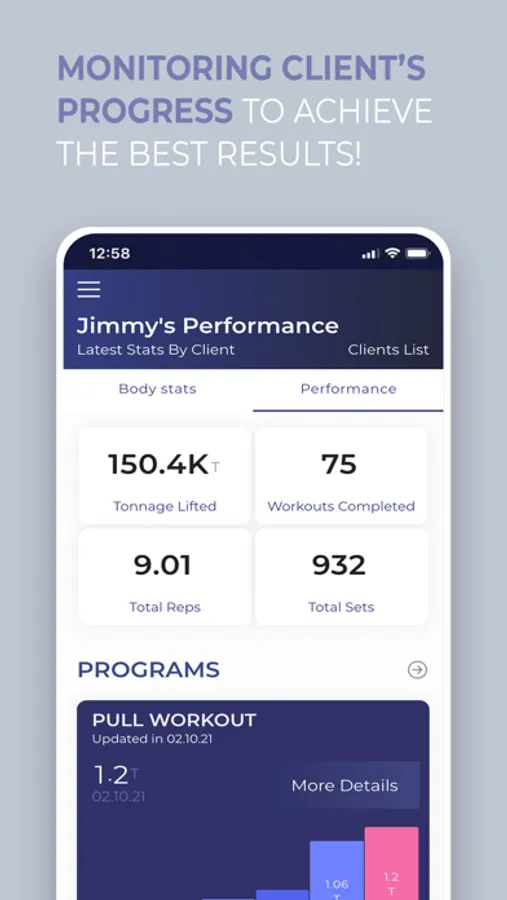 **Goal setting and tracking: body stats and performance goals targeting specific exercises/workouts customized to the client’s level.