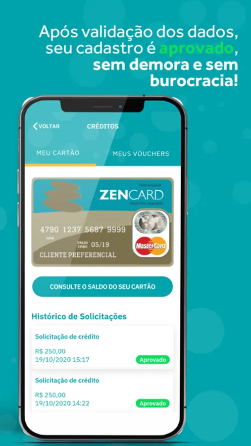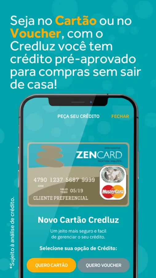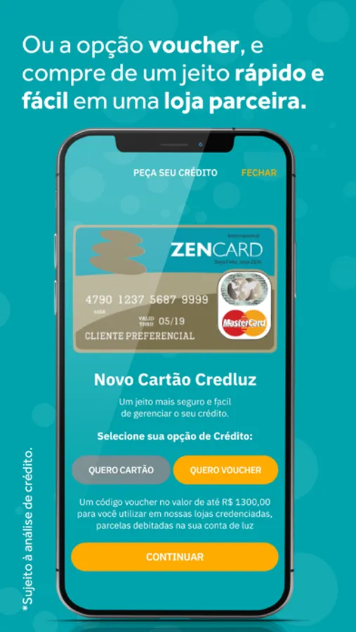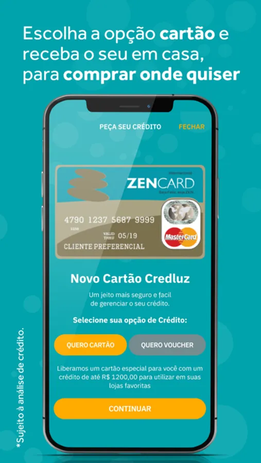 Além da possibilidade de escolher uma das centenas de lojas parceiras para fazer suas compras, agora você tem a opção de escolher o cartão Zencard, com limite de até R$ 1.200,00 para comprar onde quiser. Basta selecionar a opção “cartão” no momento de solicitar o seu crédito e pronto, depois do pedido finalizado e aprovado você recebe o seu cartão em casa em até 15 dias.