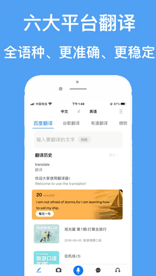 【翻译平台】 提供谷歌,百度,有道,腾讯,微软,naver翻译六大翻译平台,让您拥有更好的选择,获取更准确的翻译结果。