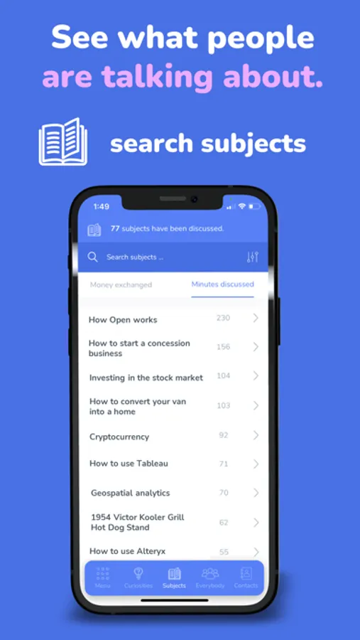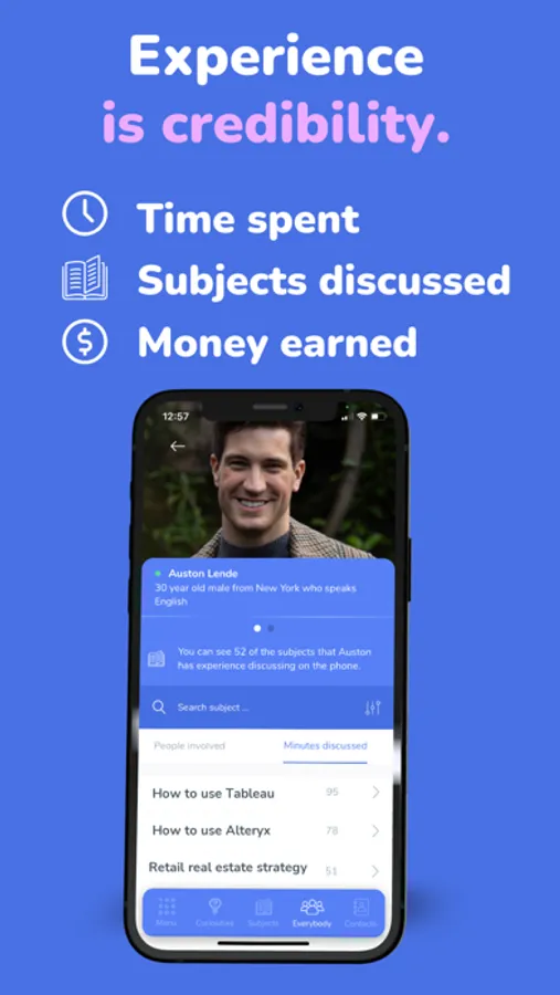 Users on a call must agree to discuss a particular subject. Once each user agrees, a timer starts and the amount of time spent discussing that subject is added to each person's profile and the public "subjects" page. This ultimately results in the ability for users to go to the subjects page, search for a subject, and find the most experienced person in that subject.