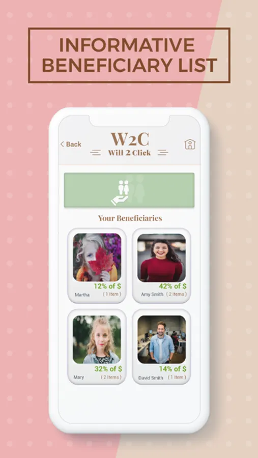 With your mobile device camera, photo each item and assign a Beneficiary from your mobile device contacts. A convenient Dashboard allows you to see your Items and Beneficiaries in one place. Easily compare how much you are giving each Beneficiary by Value and by Percentage on the Your Value screen. In the Your Beneficiary Screen, easily compare all your Beneficiaries and what you’ve given to whom. In the Beneficiary Details screen, clearly see how many Items, what percentage of your account, the total value and the photos of the Items in one convenient screen. In the Your Items screen, see what you’ve assigned to all your Beneficiaries, including photos of the Item and each Items percentage of your account. In the Item Details screen, see who you’ve assigned the Item, the Item value, and a photo of each Item.