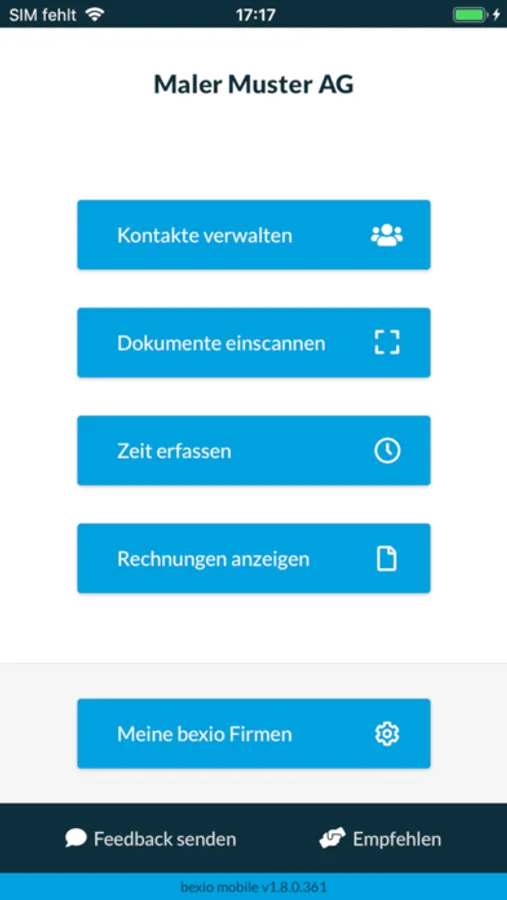 What do you think of our new app? Let us know by tapping the "Feedback" button in the bexioGo app. The button is in the dark blue area on the start page of the app.