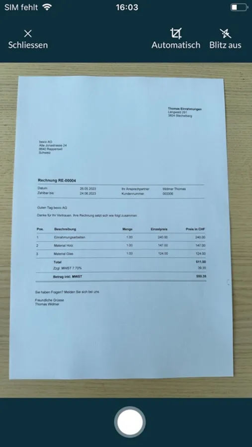* Simple document processing: Scan receipts, invoices, contracts, business cards etc. and upload them directly to bexio. When the documents have been uploaded, you can book them or attach them to existing documents and contacts. If a QR invoice is being uploaded via bexioGo, a bill with all contents is being created automatically.