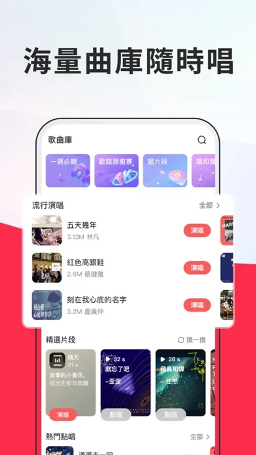 熱門音樂歌曲片段想唱哪就唱哪,支持修音調音,聽歌點歌錄歌翻唱省時又省心