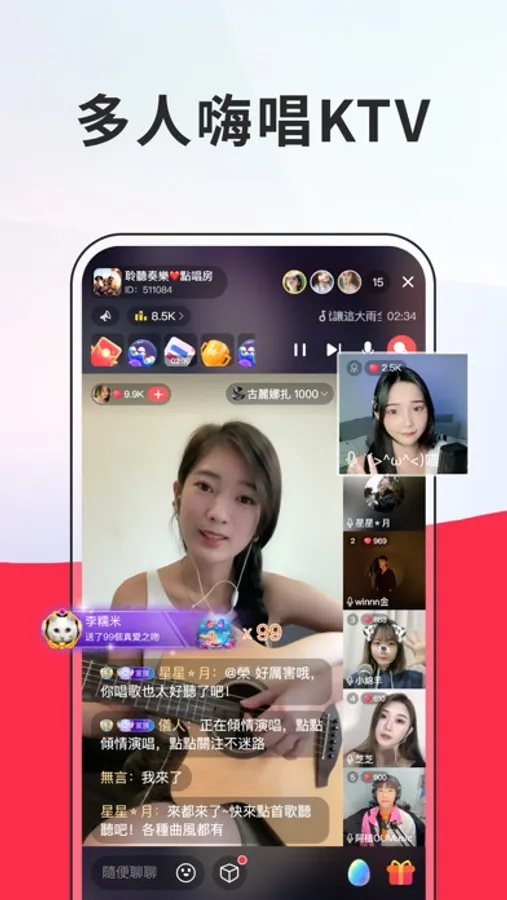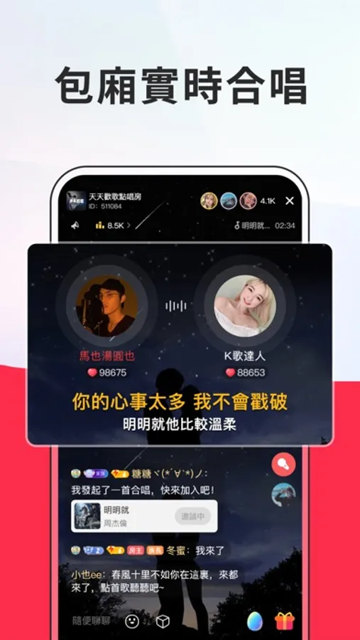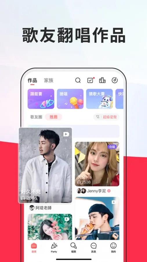 音樂大咖邀你一起歡歌party,手機卡拉ok,超多歌曲伴奏點歌點唱,AI評分查看唱歌實力,獨家K歌包間,支持語音視訊直播聊天,隨時有咖陪你在線合唱,台灣最強交友軟體,帶你暢玩搶唱音樂遊戲,還有多種音效和氛圍模式play,全民開唱更盡興!
