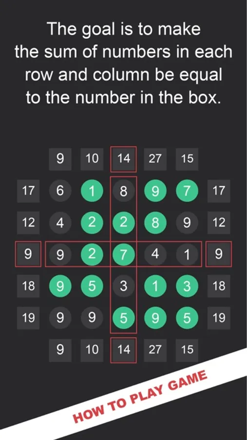 The goal is simple make the sum of numbers in each row and column be equal to the number in the box.What you have to do is to remove some numbers from the equation by clicking on them.