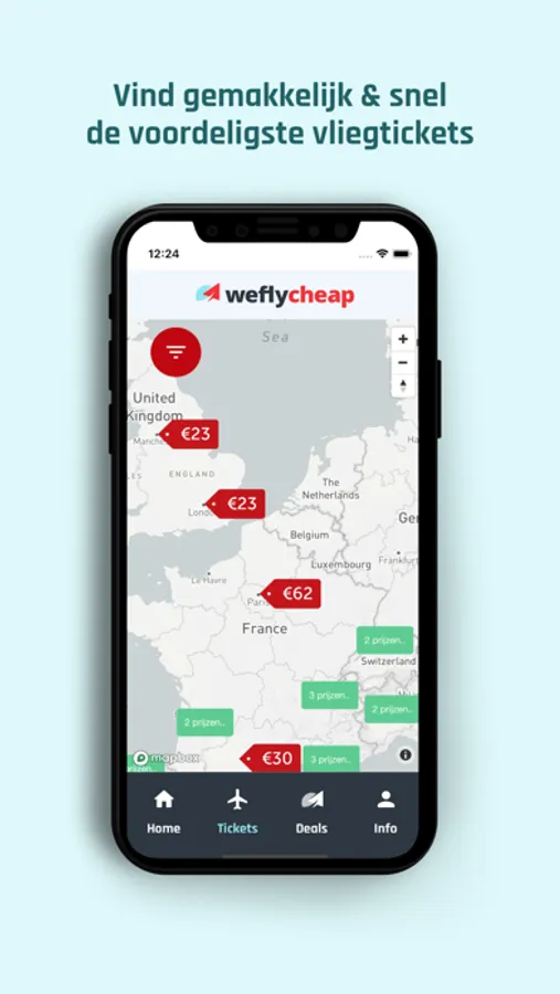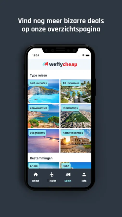 Ontvang elke dag de allerbeste WeFlyCheap deal in onze app. Wil je deze niet missen? Zet dan de pushmeldingen aan. Daarnaast vind je supersnel jouw vliegtickets via een handige kaartweergave in de app. Op zoek naar een specifieke bestemming, accommodatie of type reis? Geen probleem. Via onze app is jouw vakantie zo gevonden!