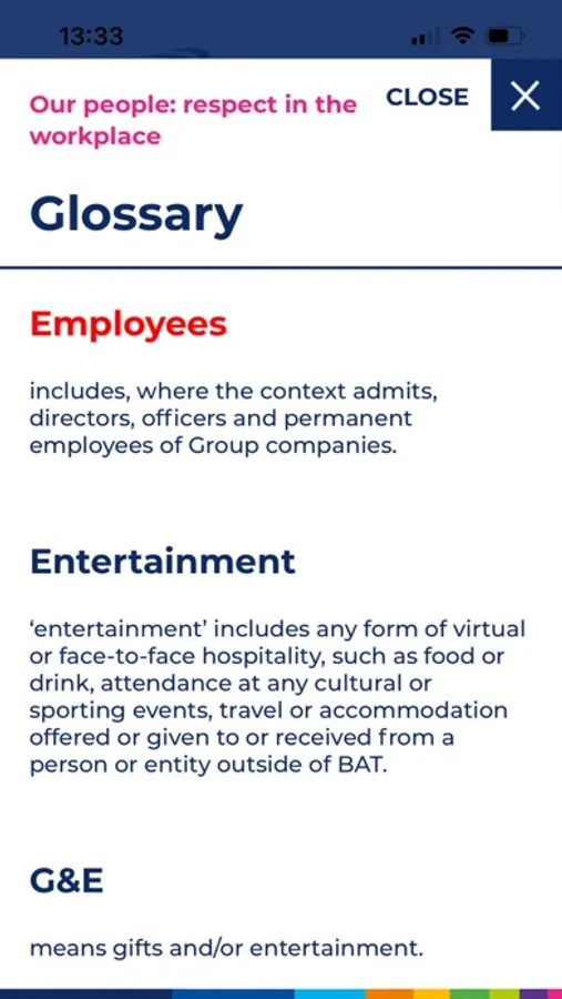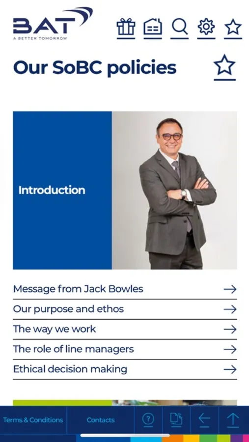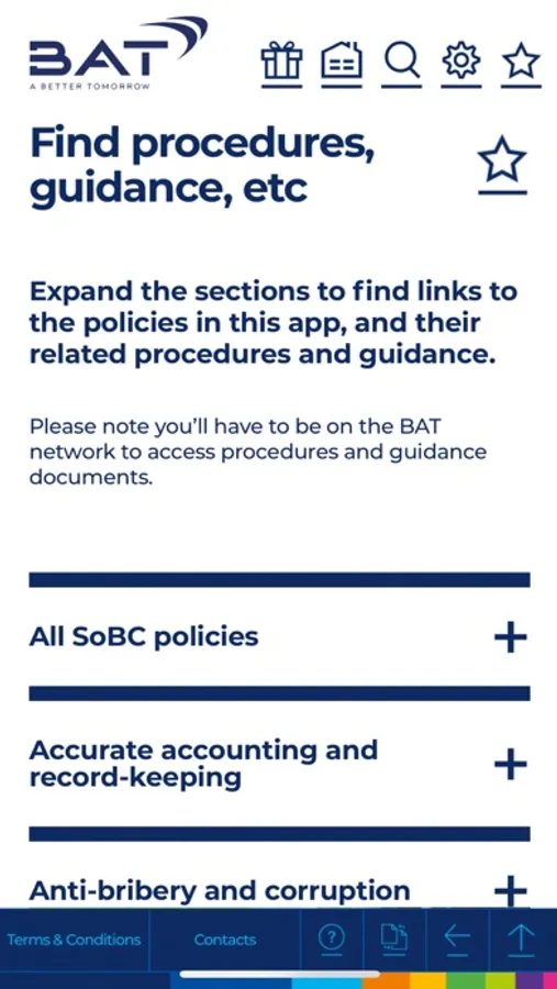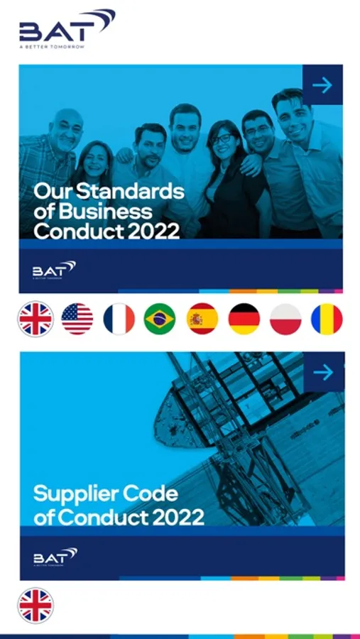 Our Standards of Business Conduct (SoBC) are a set of global policies of BAT, expressing the high standards of integrity we are committed to upholding. Our SoBC policies cover a wide range of areas including Speak Up, anti-bribery and corruption, gifts and entertainment, respect in the workplace, human rights, lobbying and public contributions, data privacy, confidentiality and information security, anti-tax evasion and anti-money laundering, sanctions and export controls, and many others.