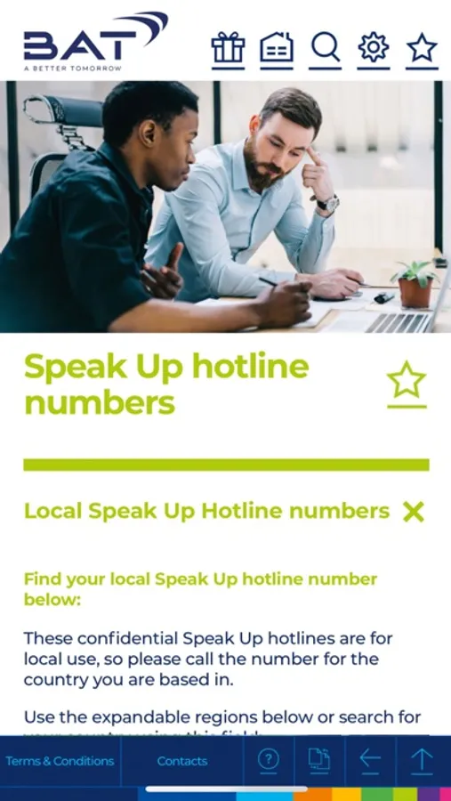 • Search for their local confidential Speak Up (whistleblowing) hotline, and call from the app