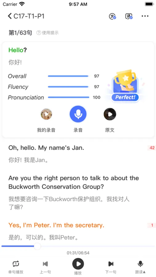 —影子跟读法训练模式,针对流利度及发音AI实时评分