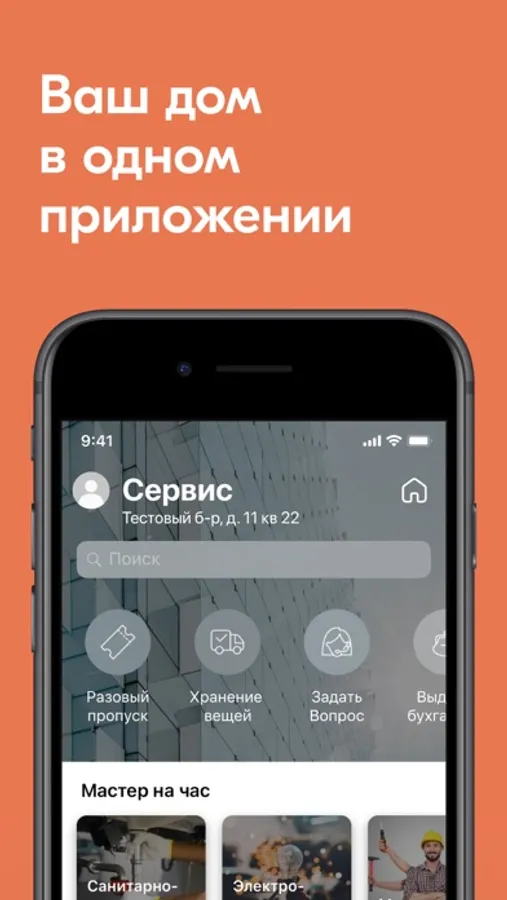 - Вызывать мастера, следить за статусом заявки, общаться в чате и оценивать качество работы;
