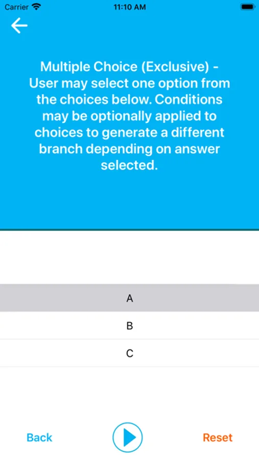- Conditional logic based on threshold (i.e. Display a different question if they answer Yes or No, or above or below a certain threshold)