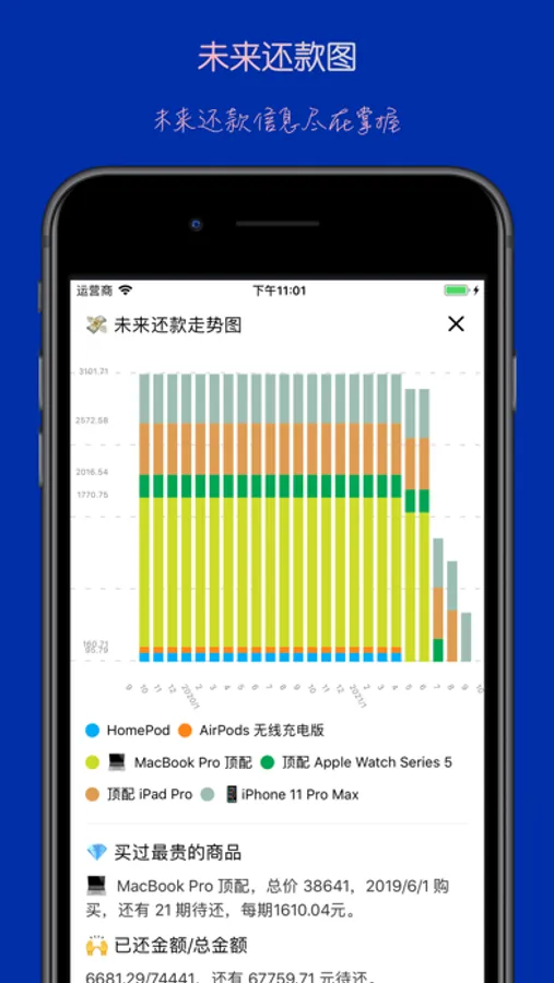 未来还款走势图:对分期数据进行处理,反馈给你最需要的信息,为你下次分期消费提供参考。