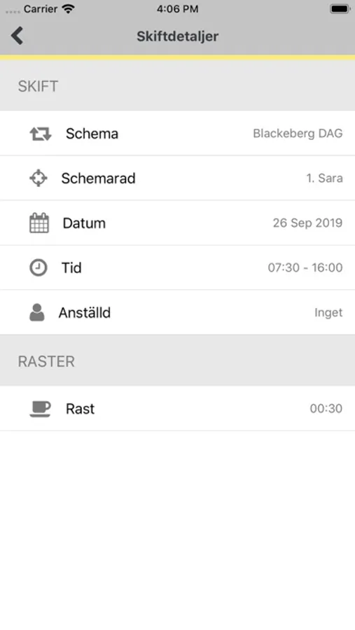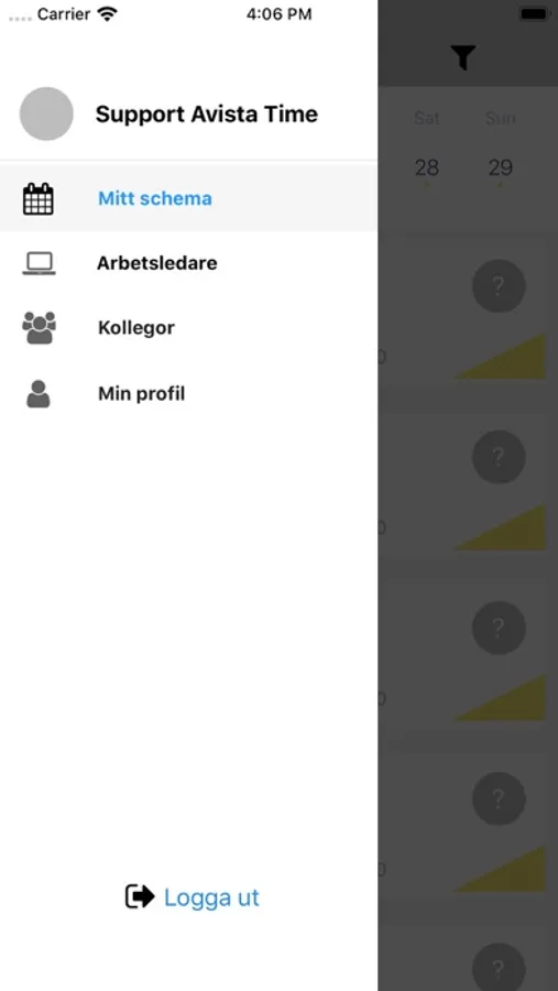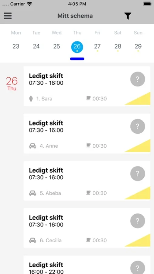 Visar planerade arbetspass. Ansöka om ledighet eller byta pass med kollegor mm.