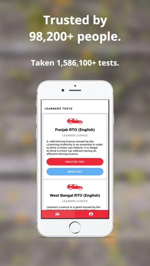 Learners Test is a driving theory practice app for Learners Licence Test questions to get a driving licence in India. People are using Learners Test to increase their chance of passing the learner test on the very first try. Learners Test provide free learner driver licence practice test questions for every Indian state. The practise tests are based on the 2019 RTO/RTA driver's manual and designed by our team of safety experts to imitate the official learners' test for your state.