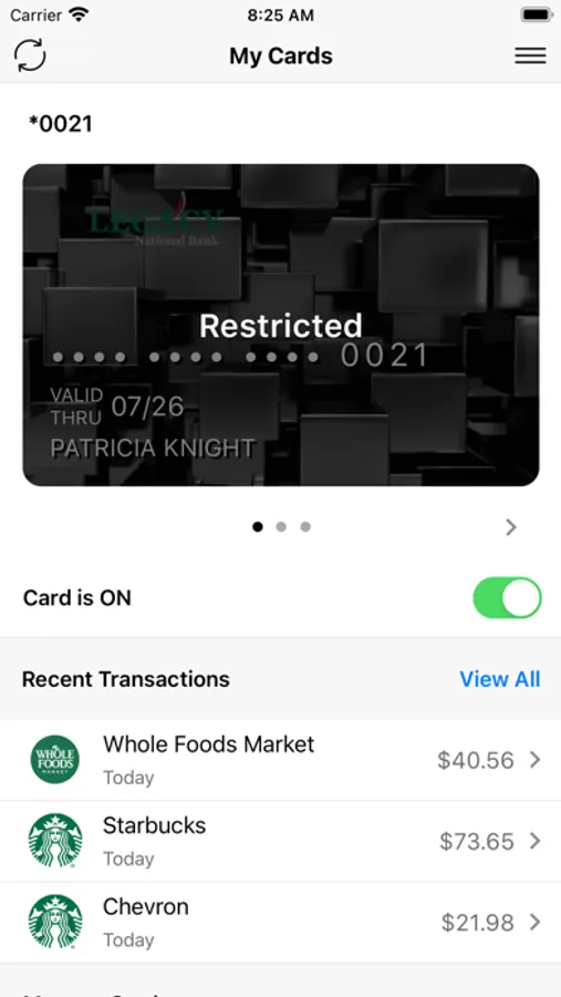 Legacy National Bank protects your debit cards by sending transaction alerts and enabling you to define when, where and how your cards are used. Download Legacy Card Valet to your smartphone, then set your preferences to monitor and manage your cards.