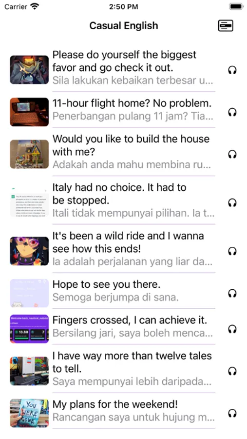 AlsoSpeak allows you to learn English effortlessly. All the sentences in this application are carefully selected from social networks and are accompanied by pictures, making learning fun and enjoyable. The sentences selected in AlsoSpeak are relatively easy and often appear in everyday conversations and writing. We add new sentences every week to keep the learning experience fresh and interesting.