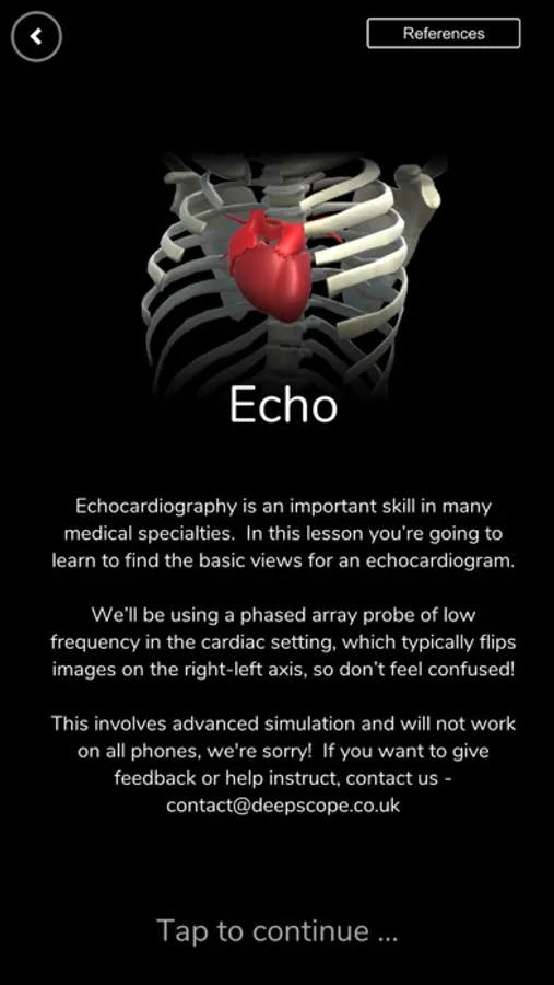 The app is designed for learning sonography or ultrasound. It can be used for Emergency Medicine (ER) ultrasound, surgery (pre-surgical) ultrasound, orthopaedic ultrasound scanning, rheumatology sonography, the vascular ultrasound examination, opthalmology ultrasound and anaesthetic ultrasound (anaesthesiology). For cardiology we have echocardiography and echo simulations.