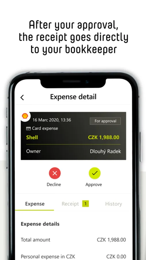 With the mobile app, the employee gets a solution where, after paying with the card, he or she immediately sees the expense, takes a picture of the just-printed receipt (which can then be discarded), adds the necessary data and sends the expense for approval.