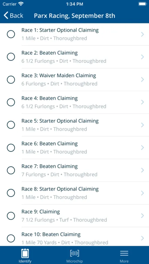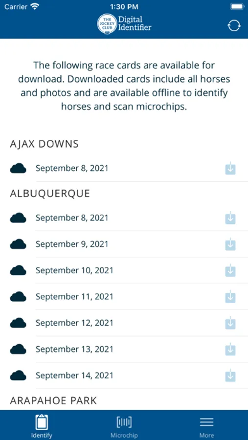 This application will allow a racetrack identifier to download final race information for upcoming days to their device to be later utilized in offline mode. This downloaded information includes data traditionally contained in the paper identifiers program along with certified horse photos and digital certificate information to aid in the identification process. Microchip information will be available for any horse that has been chipped. A special microchip icon will help the identifier locate these horses.