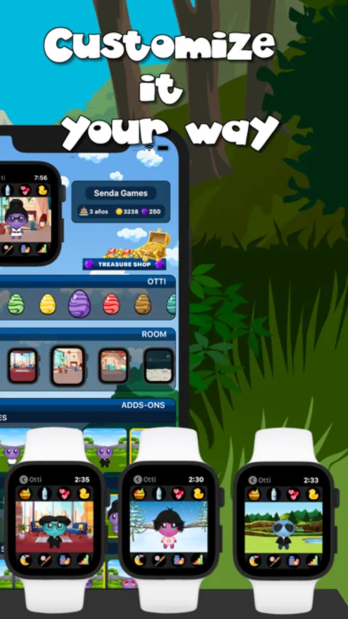 Unlock accessories and rooms to customize it your way. You are able to change Otti’s aspect from your Iphone app whenever you want to.