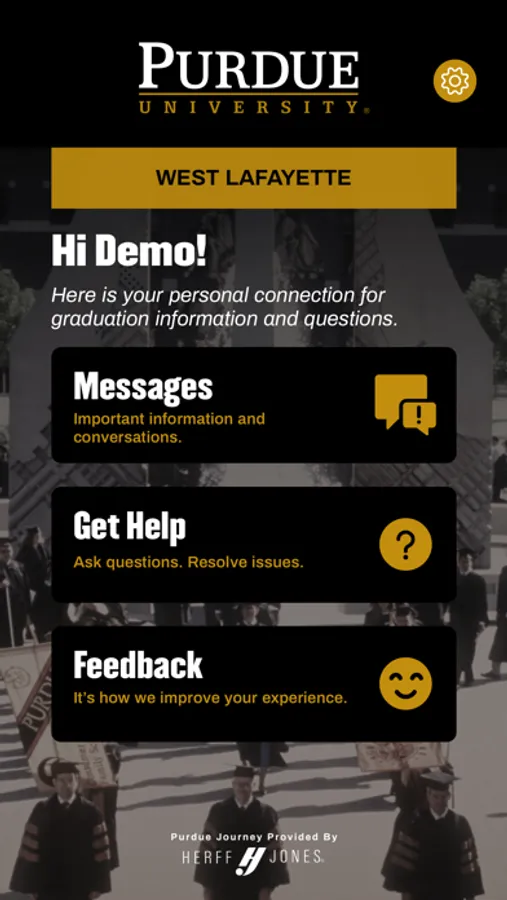 Purdue Journey is the official, private 2-way messaging app to get personalized information and ask questions, about graduation. You will also get important info from Herff Jones about your graduation cap and gown, announcements, diploma frame and more. All your graduation info in one place where it's easy to find.