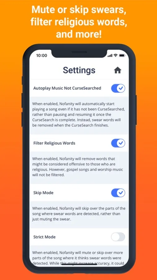 • Different Bleep Modes - You can choose to have Nofanity mute the parts of the song where the swear word occurs or have it skip over the word entirely, so you can listen to your music with as little interruption as possible!