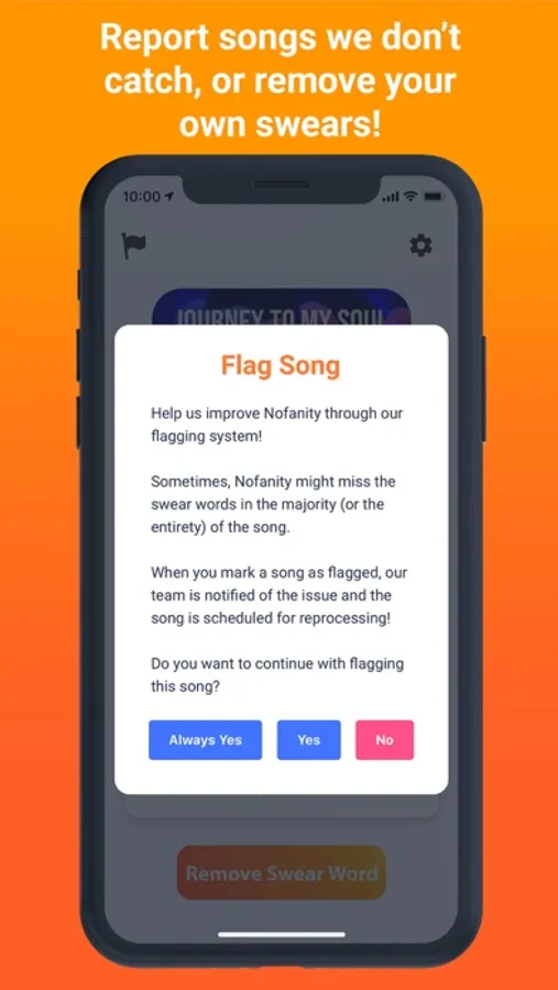 • Contribute to our Community! - Although we achieve 90% accuracy in our results, we realize this isn’t good enough. With Nofanity, you can notify our team about songs that don’t work through our Flagging System. In addition, you can even remove swear words we might have missed from directly within the app!