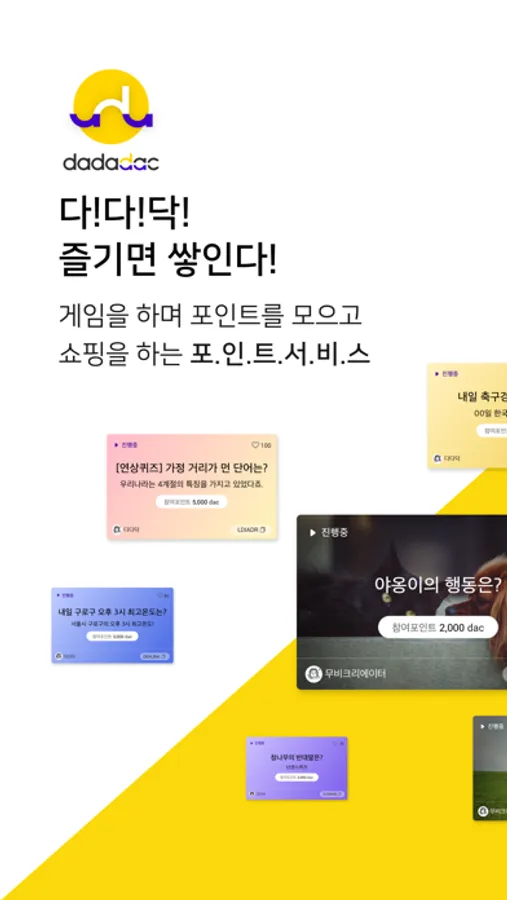 - 다다닥은 최소한의 운영 수익을 제외한 게임 컨텐츠의 수익을 생성자와 참여자에게 제공 합니다.