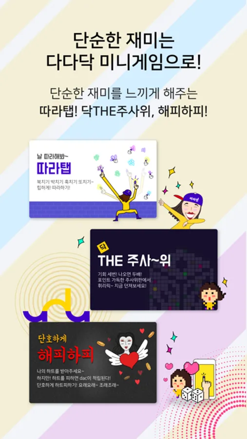 - 다다닥의 모든 게임 컨텐츠는 사용자에 의해 생성 됩니다. (초기 안정화 기간의 경우 회사 참여)