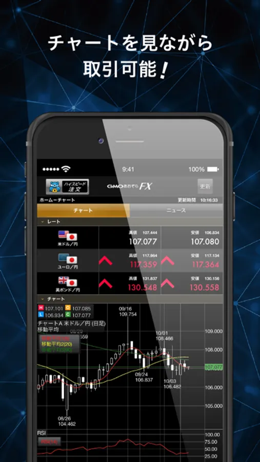 チャートやマーケット情報はもちろん、ワンクリックで注文可能な「ハイスピード注文」から設定されたレートをお知らせするプッシュ通知機能までいつでも、どこでも取引いただけます。