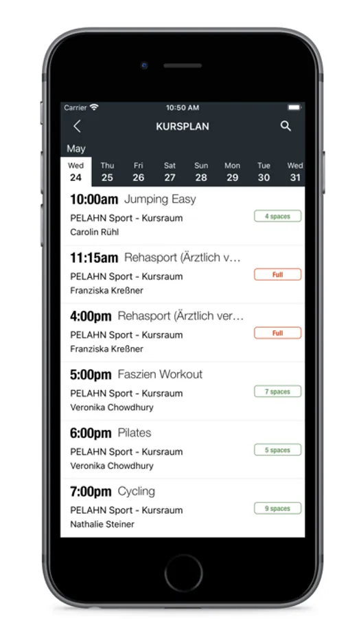 Direkter und aktueller Zugriff auf den Kursplan von überall: Für jeden Kurs kannst Du Details wie Zeit, Kursbeschreibung, Raum und Merkmale wie z.B. den Schwierigkeitsgrad einsehen.