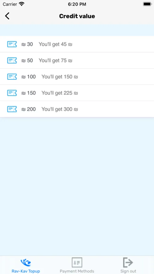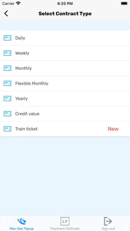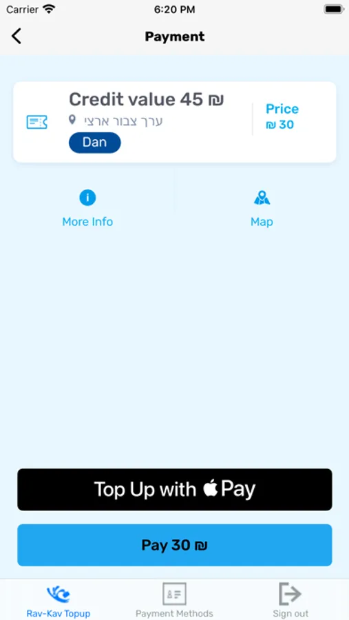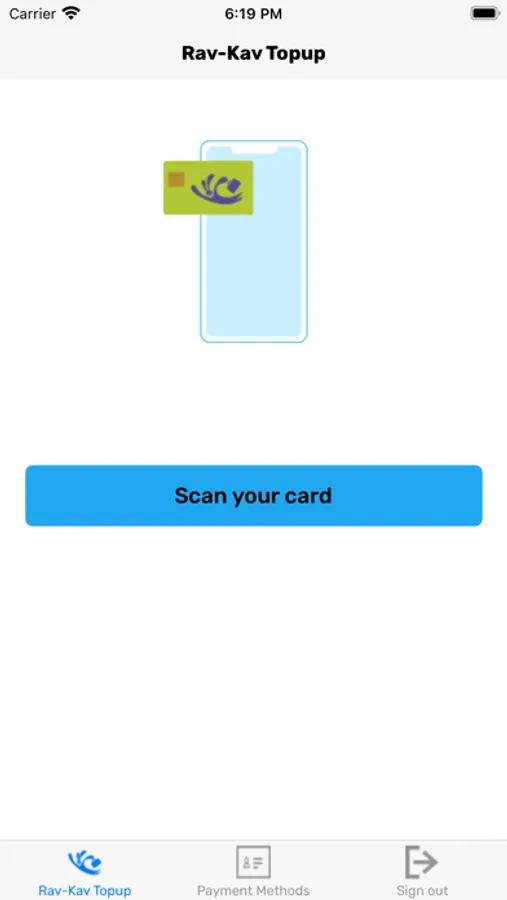 Tap the Rav-Kav card near the camera area on your device (back or front), check your balance, select the contract you want, pay using all major credit cards, debit cards or Apple Pay. Don't forget to tap your Rav-Kav again to complete the topup and you're ready for your next journey!
