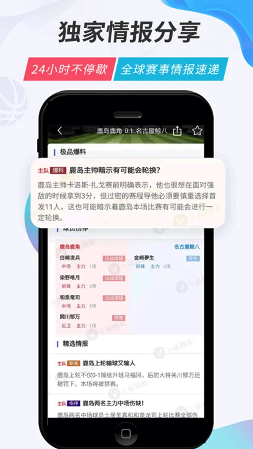 V站是一款涵盖全球足篮球赛事动画、比分数据、赛事资讯、名家分析的APP。我们提供世界上超过200多个国家和地区的足球篮球赛事即时数据、动画直播、赛事数据和球队资料等信息。