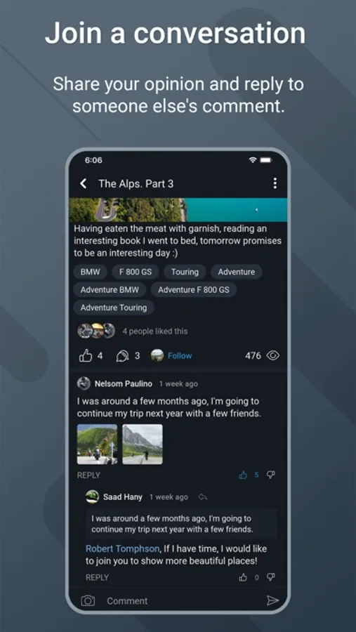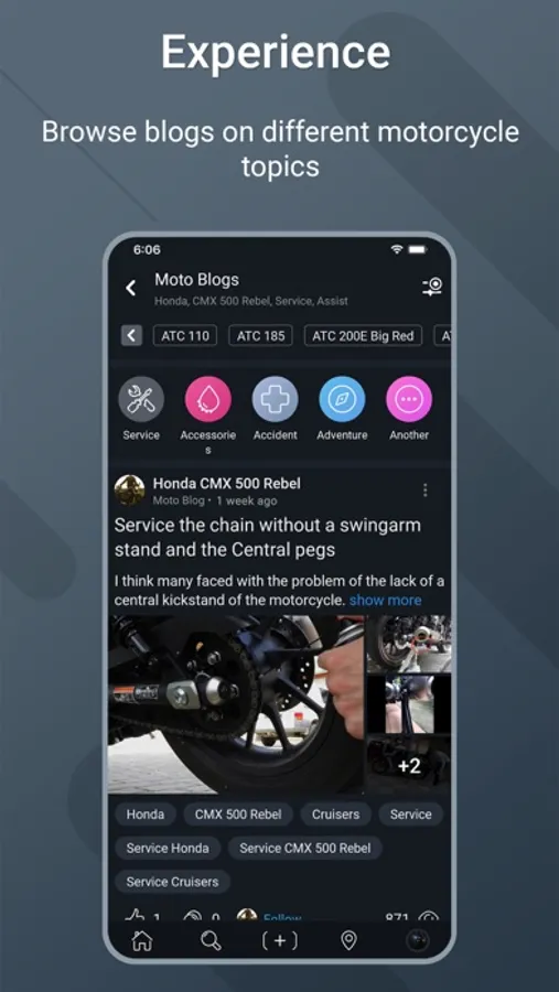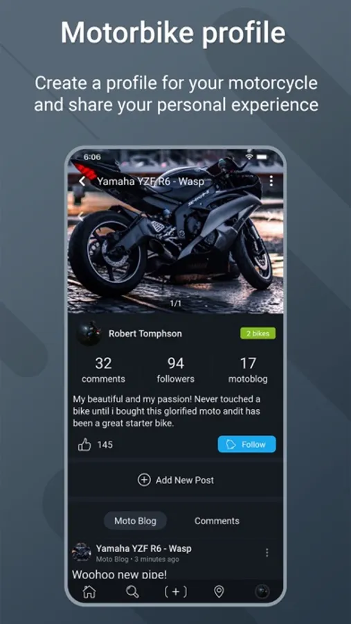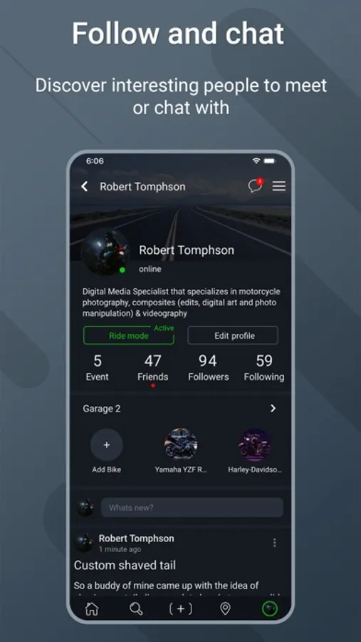 - Follow interesting users or motorcycles and read about their social activity in your feed