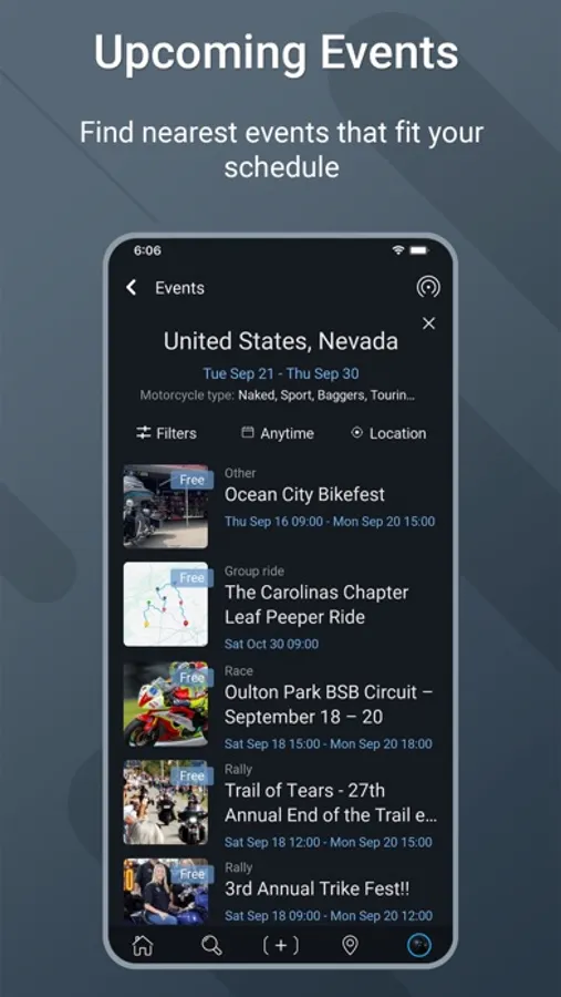 - Find events like bike night, charity, poker day from your chosen location at any time convenient for you