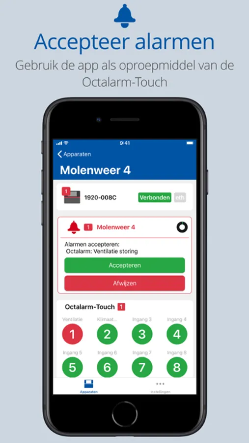 With this app you can receive high priority alarms. Critical alarms from the Octalarm-Touch always make a sound, even when the phone is on silent. This way you prevent damage and production loss.