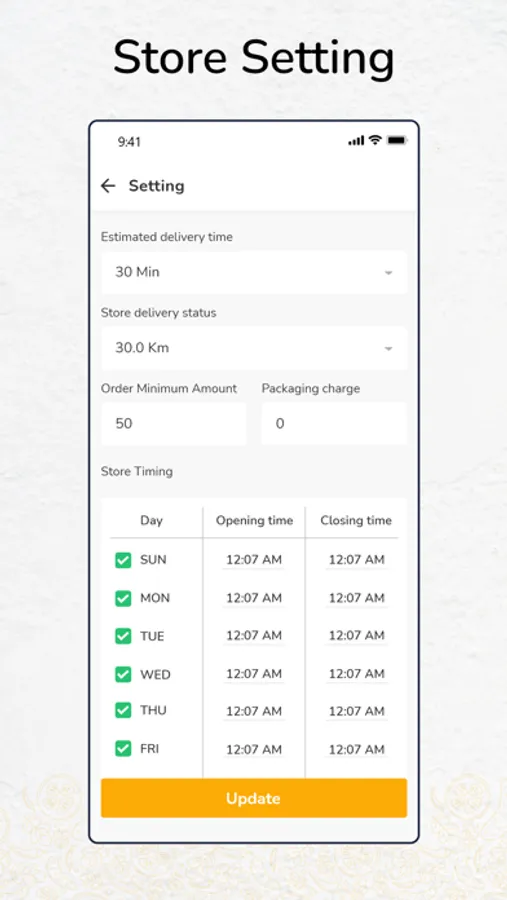 Manage restaurant details like delivery time, restaurant time, packaging charge, delivery area radius, minimum order amount, Estimated delivery time, etc