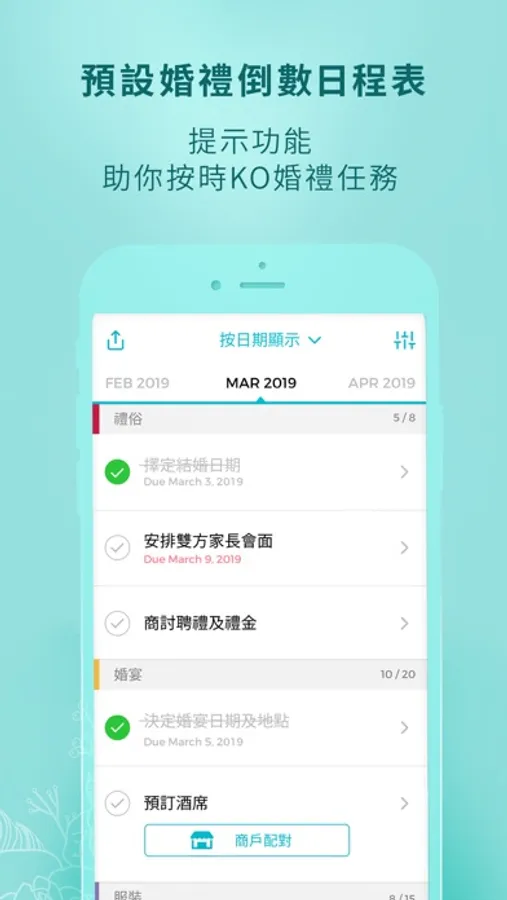 涵蓋婚禮各項大小事務,讓準新人方便記錄婚事籌備進度及備忘事項。每項婚禮任務皆設鬧鐘提示功能,提醒你按時完成婚禮統籌checklist。