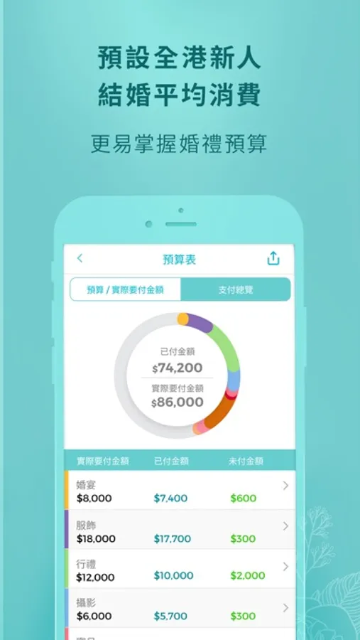 預設ESDlife生活易全港結婚消費調查結果作為參考數字,當中包括婚宴、婚紗禮服、婚戒首飾、傳統習俗及新居裝修等,讓準新人更易掌握婚禮預算及開支。