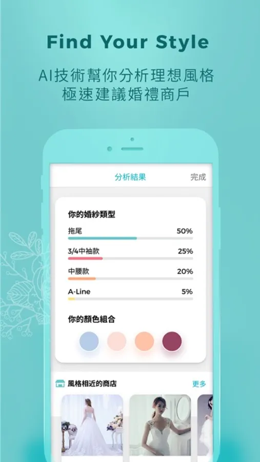 準新人可使用結合AI功能的「Find Your Style」功能,瀏覽近萬張由婚禮商戶所提供的產品照片(包括酒店及酒樓婚宴場地、婚紗、男禮、婚戒、新娘化妝、婚紗攝影等)。透過AI技術,WeVow能鎖定新人的理想風格及喜好,極速建議合適婚禮商戶,助你打造夢想完美婚禮。