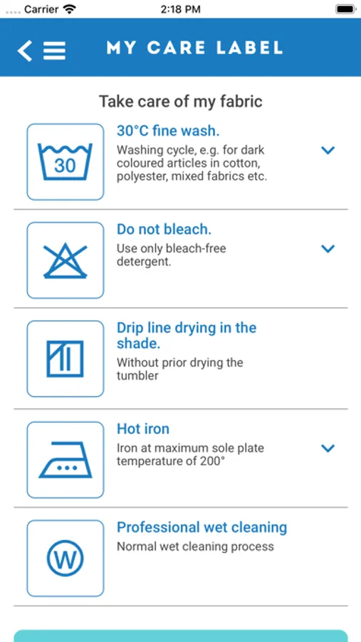 MY LABEL also includes a “Wardrobe” feature to help you store the labels of all your favourite fabrics! Take a picture of your item, enter its label description, and you're done: all the instructions will be stored in your virtual dressing room. No need to dig out the label next time you’ll want to wash your fabric and no worries either if you’ve cut it out.