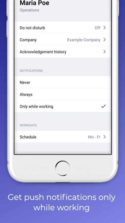 Push notifications are only sent while working, protecting each team member time. And everybody can connect and discuss professional matters without sharing their personal phone numbers.