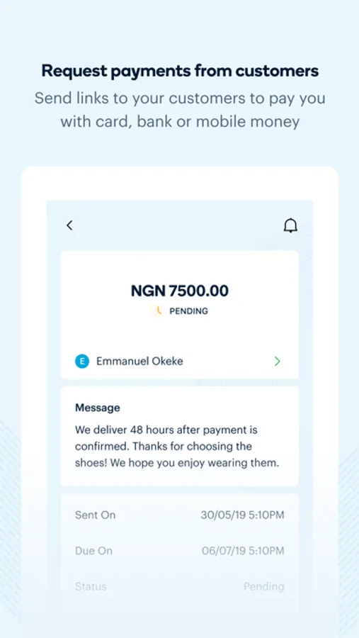 * Request payments from customers and get paid internationally with payment methods like cards, bank accounts, USSD and mobile money