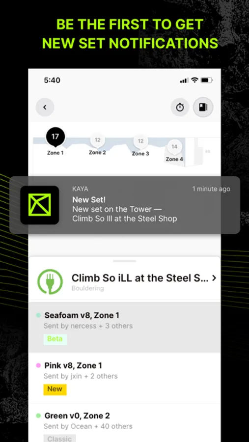 KAYA is community-focused. You’ll be notified when your buddy breaks into a new grade so you can leave ‘em a fist-bump and a comment. In-app messenger allows you to connect with other climbers, and, if your gym is on KAYA, receive new set notifications when the routesetting team finishes slinging the freshies.