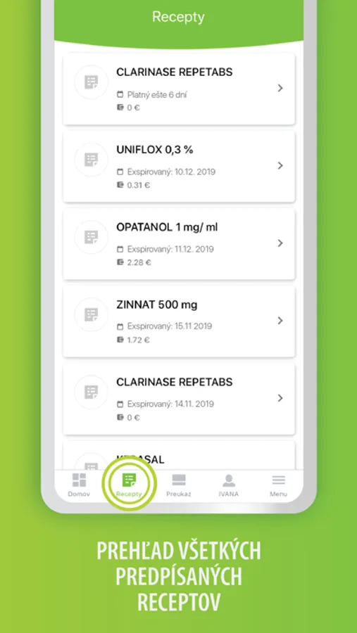 Prehľad všetkých predpísaných receptov vrátane tých, ktorým už vypršala platnosť, alebo boli vyzdvihnuté. Vaše predpísané recepty si môžete v lekárni vyzdvihnúť aj na základe čiarového kódu, ktorý nájdete priamo v aplikácii.