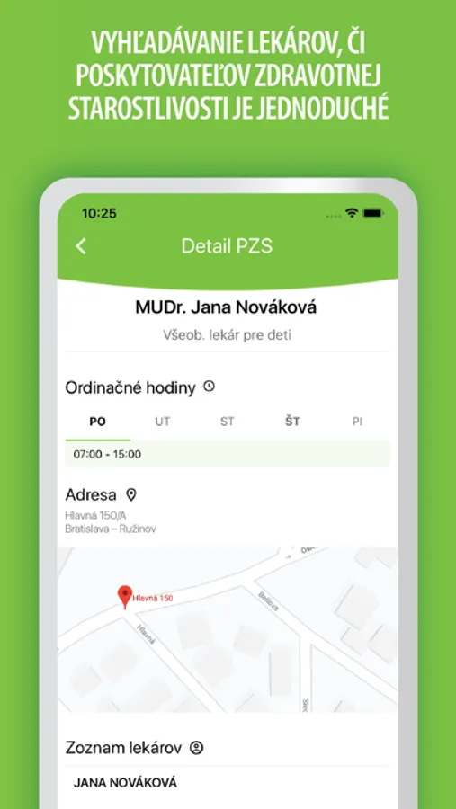 Vyhľadajte si jednoducho lekára, pohotovosť, nemocnicu, lekáreň atď. Zoznam lekárov vám umožní pozrieť sa na detaily, ako sú ordinačné hodiny, mapa s možnosťou okamžitej navigácie k lekárovi, kontaktné údaje s možnosťou zavolať priamo lekárovi.