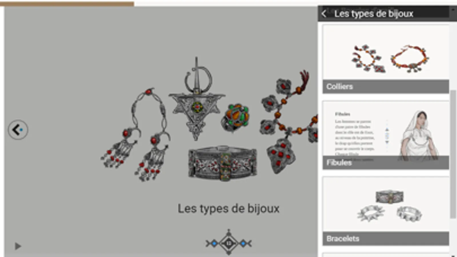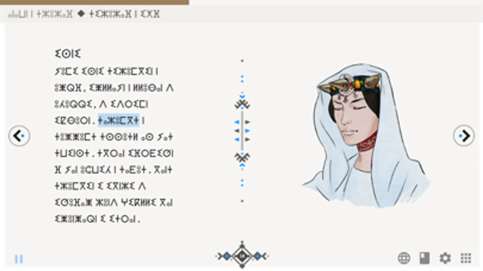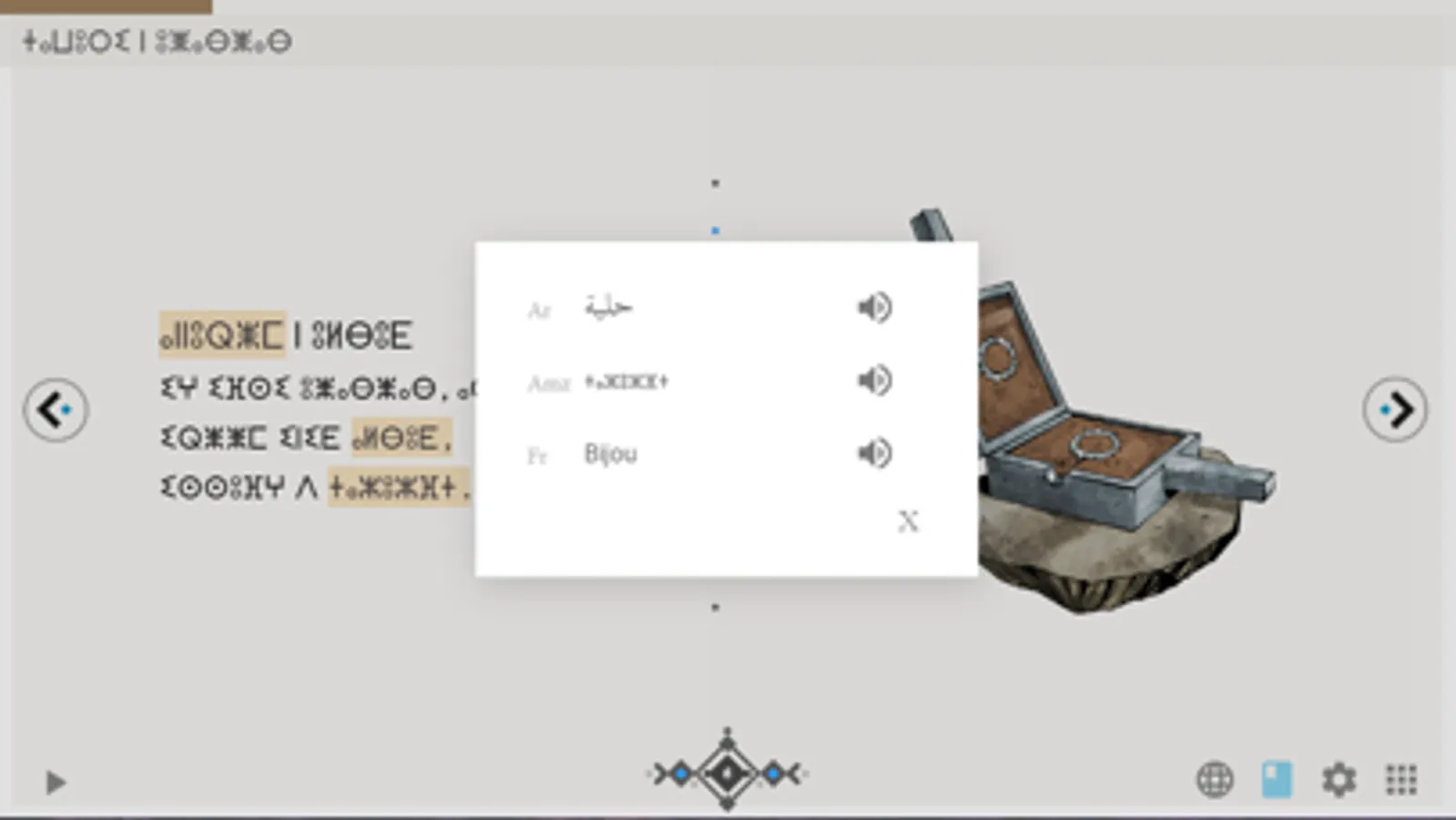 Il propose deux modes de lecture : un accès séquentiel de page et un accès sélectif par thème puis par page. Il dispose d’un dictionnaire qui donne la possibilité de toucher un mot pour voir son explication sous forme d’équivalents dans les autres langues supportées par l’application. Il est raconté par des locuteurs natifs et assure une lecture avec mise en surbrillance des mots lus au rythme de la lecture. En outre, il offre la possibilité de re-écouter la prononciation d’un mot en le touchant pour ancrer son apprentissage.