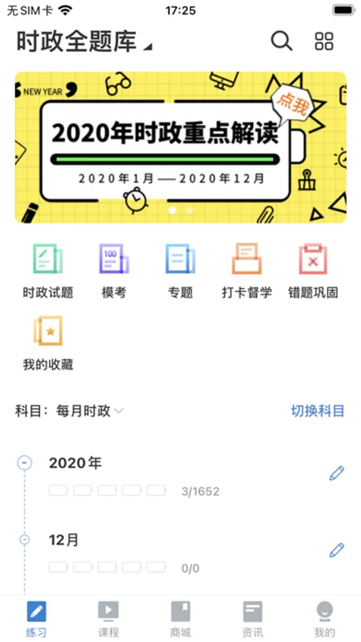 时政全题库:每月时政、会议文件、领导讲话、各省时政,其中每月时政、会议文件、领导讲话为免费题库。